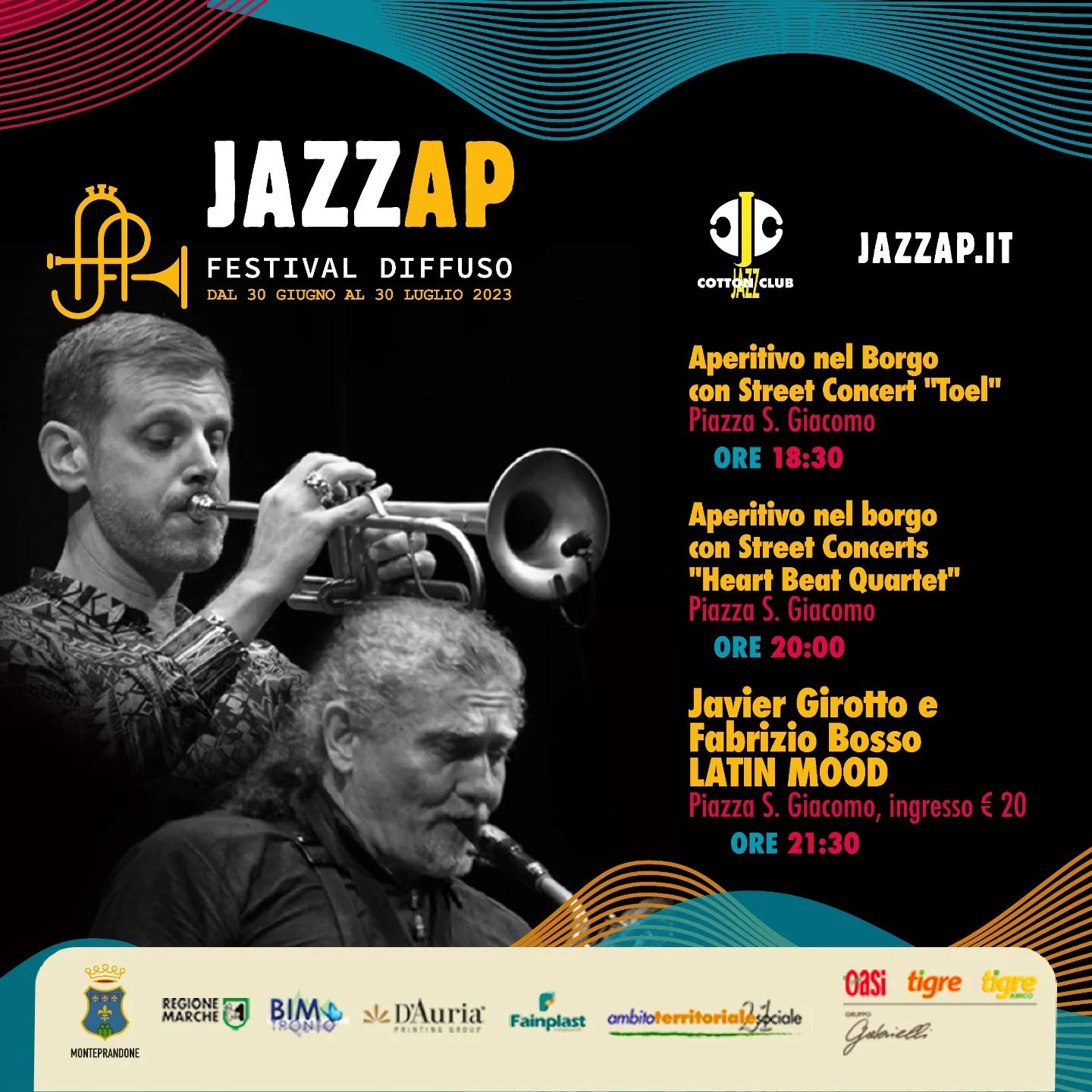 Sabato 8 luglio in Piazza San Giacomo a Monteprandone, alle 21.30 salgono sul palco i Latin Mood (ingresso 20 euro) guidati Javier Girotto e Fabrizio Bosso, con Natalio Mangalavite al piano, Luca Bulgarelli al contrabbasso, Lorenzo Tucci alla batteria e Bruno Marcozzi alle percussioni.