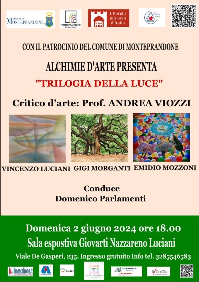 Inaugurazione nella sala ”Nazareno Luciani”della mostra d’Arte, ”Trilogia della Luce” al Centro Giovarti via de Gasperi,235 Centobuchi, con il patrocinio del comune di Monteprandone, con la collaborazione di Avis Monteprandone, Auser Monteprandone e con Farmacia San Giacomo e Code Service e con la supervisione del critico d’Arte prof. Andrea Viozzi.Esporranno le loro opere: Vincenzo Lucani, Gigi Morganiti, Emidio Mozzoni.