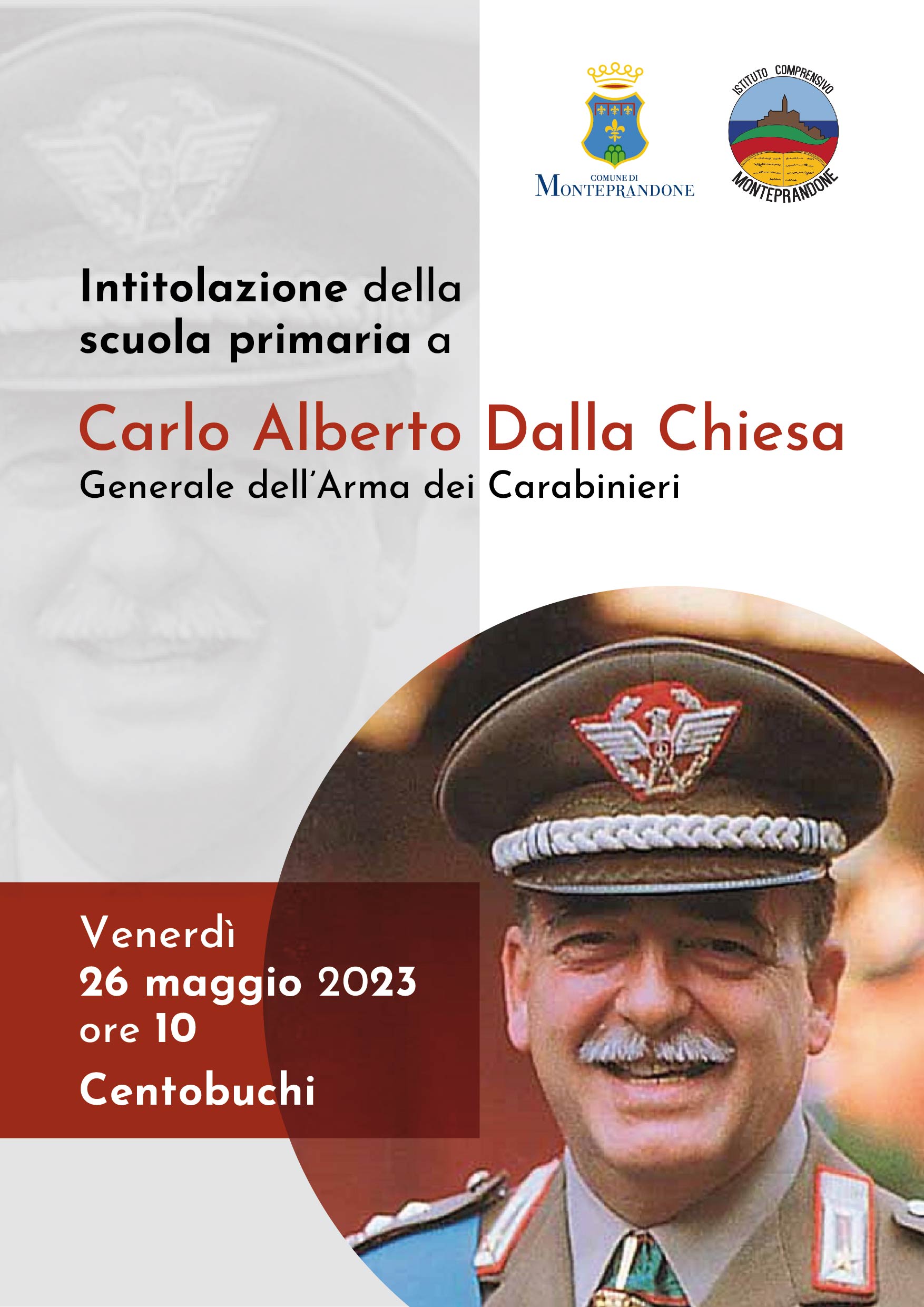 La scuola primaria di Centobuchi sarà intitolata al Generale Carlo Alberto Dalla Chiesa. La cerimonia si terrà venerdì 26 maggio, presso il plesso di via Benedetto Croce.