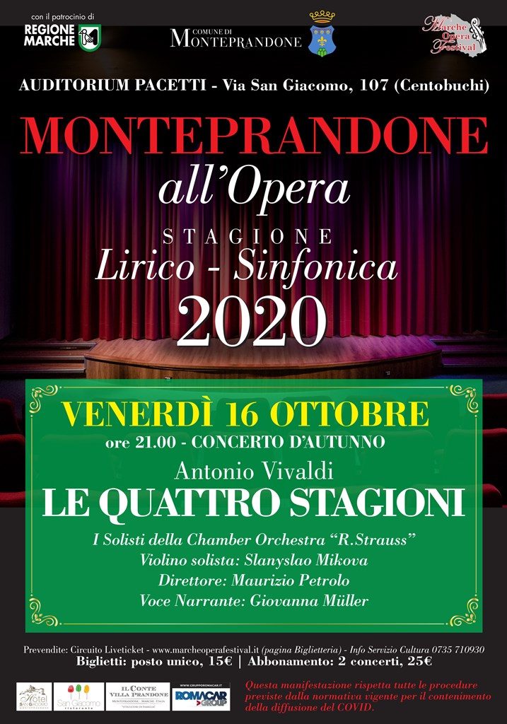 Costo biglietti: singoli concerti posto unico 15 euro; abbonamenti: 2 concerti 25 euro; 4 concerti 45 euro. Prevendite circuito Liveticket www.marcheoperafestival.it (pagina biglietteria). Per informazioni servizio Cultura Comune di Monteprandone 0735710930.
