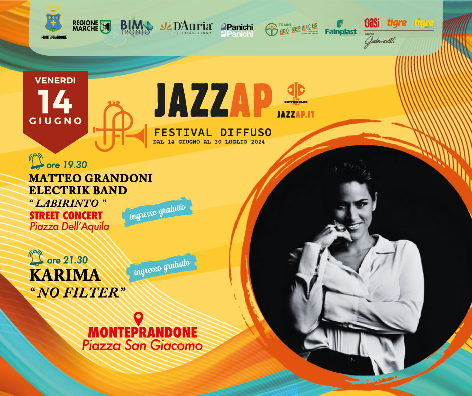Venerdì 14 giugno alle 21.30 a Monteprandone, in piazza san Giacomo, sarà la cantante Karima con il nuovo progetto “No Filter” a inaugurare ufficialmente JazzAp 2024. Qualche ora prima, alle 19.30 in Piazz dell’Aquila, è previsto lo street concert della Matteo Grandoni Electrik Band.