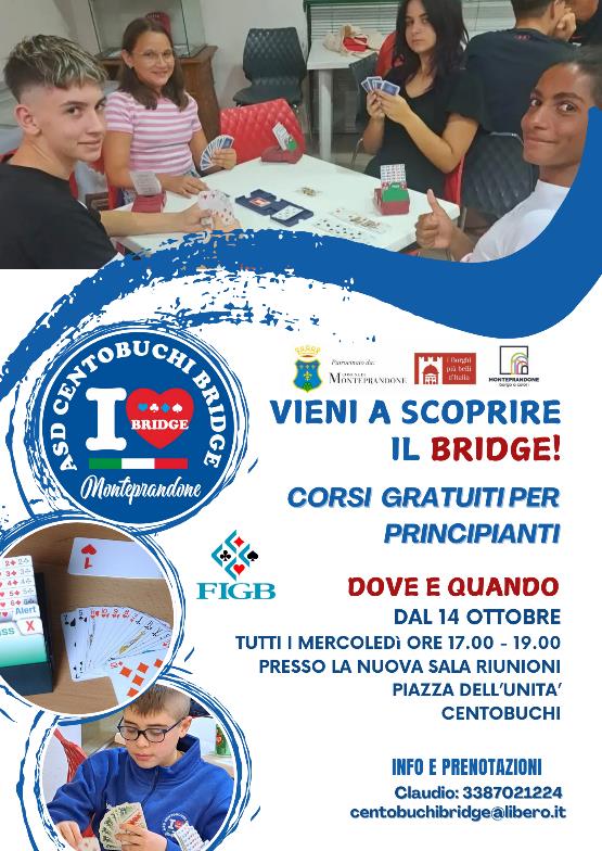 L’ASD Centobuchi Bridge, con il patrocinio del Comune di Monteprandone, offre un corso di bridge per principianti completamente gratuito, rivolto a chiunque abbia curiosità di conoscere questo affascinante “sport della mente”, senza limiti di età.