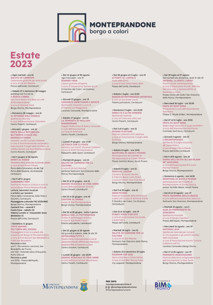 Il cartellone degli eventi estivi è realizzato con la collaborazione delle tante associazioni del territorio, grazie al contributo di Bim Tronto e delle tante aziende del territorio e non: Banca del Piceno, Teknonet srl, Farmacia Comunale srl, Picena Express Srl – GLS, Inim Electronics srl, Baden Haus s.p.a., Farmacia Amadio, Femac, Orsini & Damiani, Sagi, Brass Production, Tiamare, Mia Arredamenti, NIUO, Picena Zinc, Esca, Giobbi srl, Genny srl.