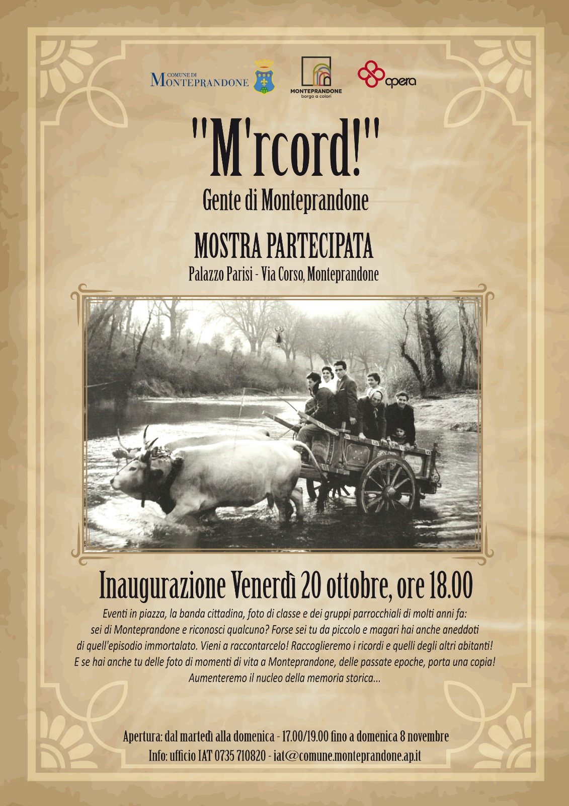 "M'rcord! Gente di Monteprandone" è il titolo della mostra partecipata in programma presso Palazzo Parissi, in via Corso, nel borgo storico, a Monteprandone. Gli eventi in piazza, la banda cittadina e momenti di vita vissuta nella comunità di molti anni fa.