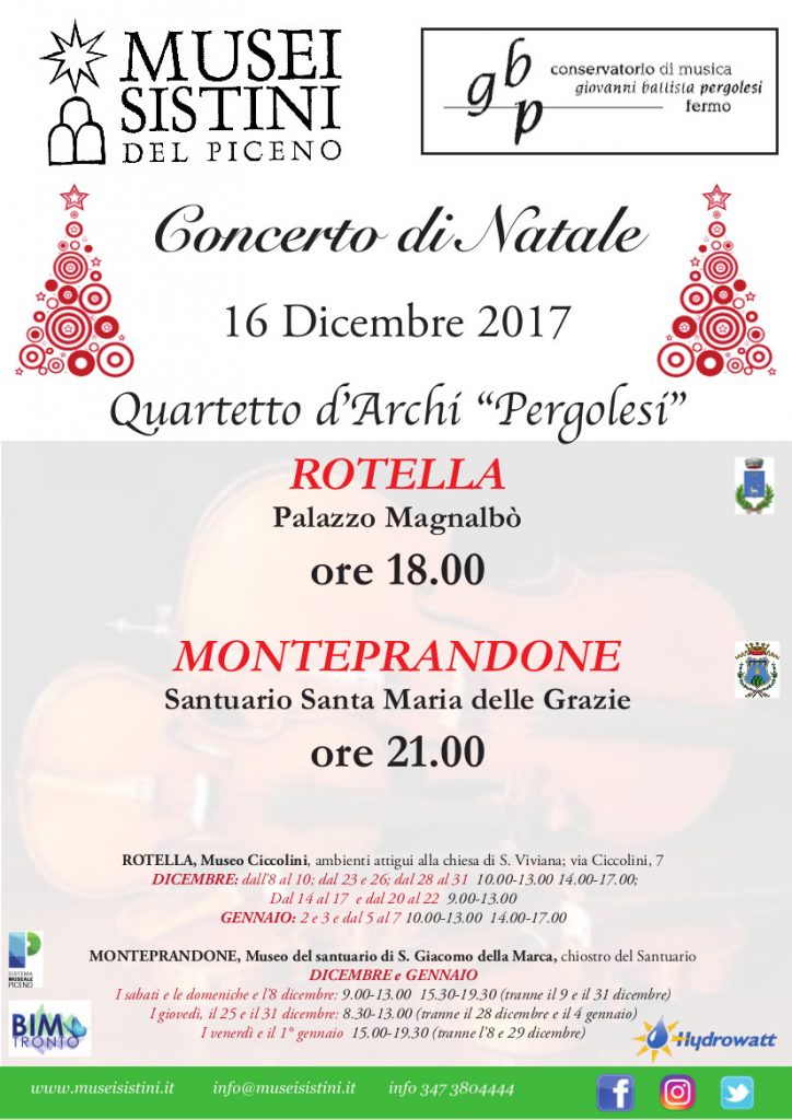 Il doppio appuntamento, alle 18 a Palazzo Magnalbò di Rotella e alle 21 nel Santuario Santa Maria delle Grazie e San Giacomo di Monteprandone, sarà un concerto del Quartetto d'Archi "Pergolesi". L'iniziativa gode del patrocinio dei Comuni di Monteprandone e Rotella e del Bim Tronto. L'ingresso è gratuito.