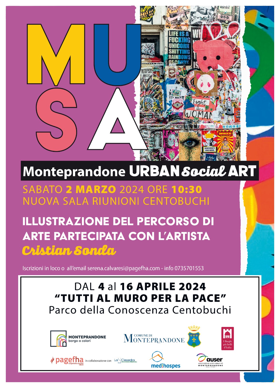 Prende vita a Monteprandone MUSA - Monteprandone Urban Social Art, festival di street art che ha l’obiettivo di promuovere e valorizzare questa forma artistica, offrendo spazi piccoli o grandi all’arte, portando la creatività sui muri di Monteprandone e Centobuchi. Una proposta culturale per trasformare il turismo mordi e fuggi in turismo stanziale, lento e di qualità anche attraverso il brand Monteprandone #borgoacolori, nella consapevolezza che innovazione dell’arte murale e tradizione di un borgo storico possano formare un connubio vincente per attrarre visitatori e turisti sul territorio.