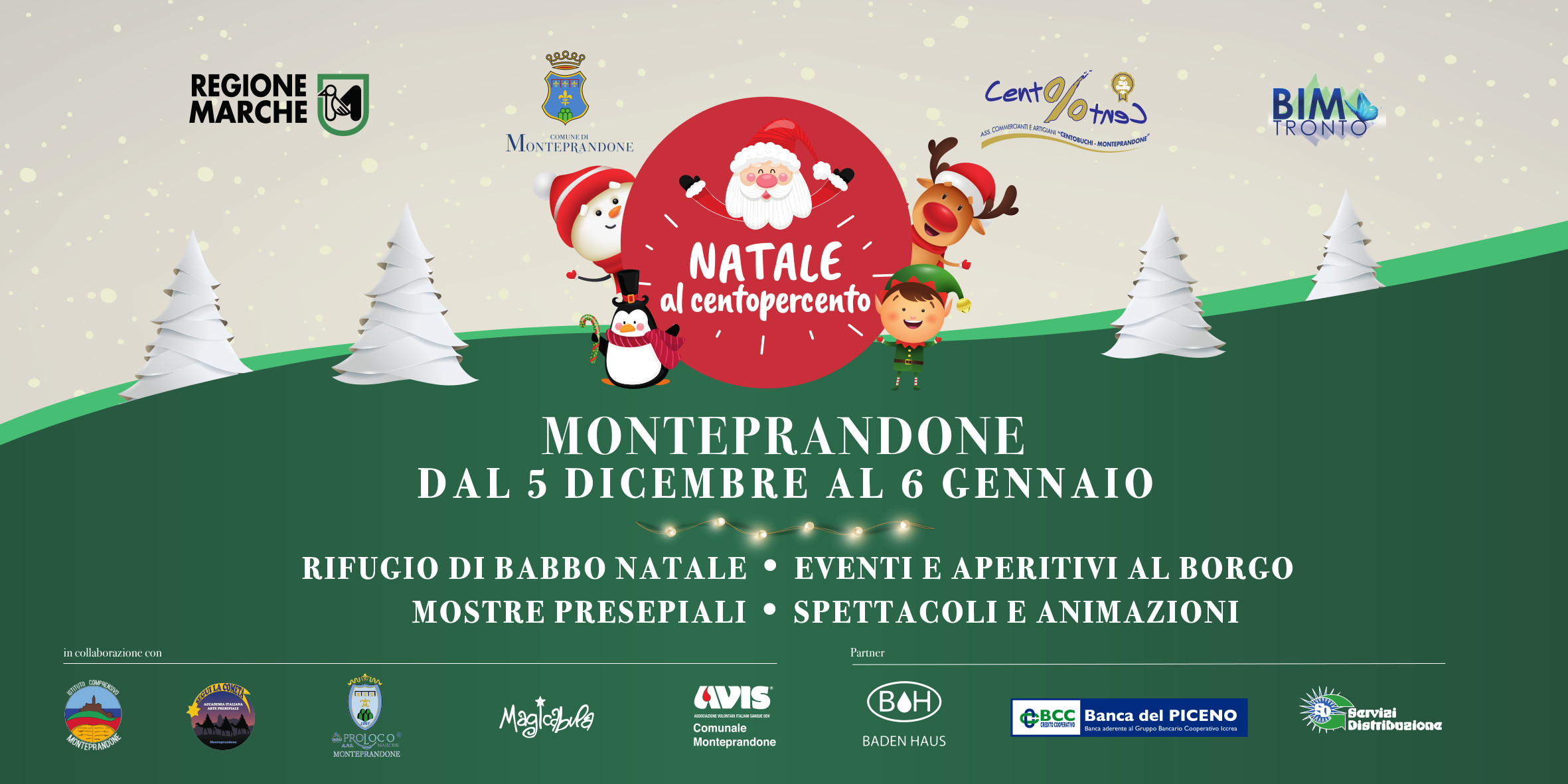 Il cartellone degli eventi 2021/2022 è ricco di iniziative e realizzato grazie alla partecipazione e al coinvolgimento di tutte le forze vitali del paese. Oltre alla Centopercento, concorrono infatti in maniera determinante alla manifestazione, le associazioni Proloco Monteprandone, Segui la Cometa, Avis Monteprandone, l'Istituto comprensivo di Monteprandone e l’asilo nido e ludoteca Magicabula.