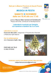 L’incontro si terrà sabato 9 dicembre, dalle 16:45 alle 17:45, nella Nuova Sala Riunioni, in piazza dell’Unità a Centobuchi. Il laboratorio è curato da Emanuela Marcattili, insegnante di propedeutica musicale e referente NpM Marche in collaborazione con volontarie e volontari NpL e NpM. E’ necessario portare un telo o una stuoia. L’ingresso è libero, con prenotazione obbligatoria via email a: natipelamusicamar@gmail.com