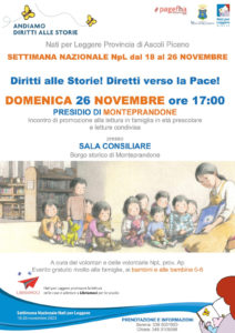 Ad un anno dalla costituzione, presso l’Asilo Nido Comunale, del presidio Nati per Leggere (NpL) di Monteprandone, uno spazio dedicato al programma nazionale NpL, iniziativa pedagogica e culturale promossa dall’azione congiunta dell’Associazione Italiana Biblioteche, dell’Associazione Culturale Pediatri e del Centro per la Salute del bambino, tante le iniziative in programma per i bambini e le bambine di età compresa tra 0 e 6 anni, organizzati dall’Amministrazione comunale, in collaborazione con i volontari e le volontarie Nati per Leggere della Provincia di Ascoli Piceno e le educatrici del nido della Cooperativa Sociale Pagefha.