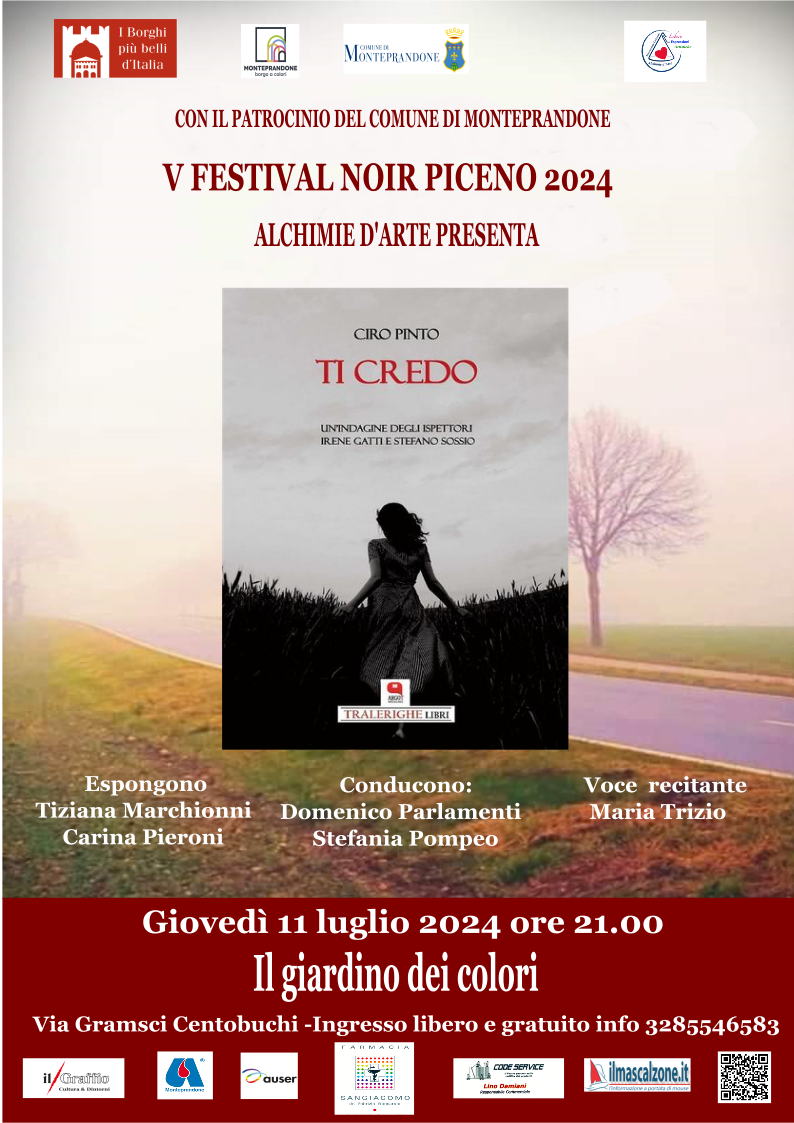 Sesto e ultimo appuntamento per il 5° Festival Noir Piceno 2024 con Ciro Pinto che torna ancora una volta a Centobuchi, a cura dell’associazione Alchimie d’Arte con il patrocinio del Comune di Monteprandone e la collaborazione di Avis Monteprandone, Auser insieme Monteprandone con gli sponsor Farmacia San Giacomo e Code Service. L’evento si svolgerà Giovedì 11 luglio alle ore 21, presso “Il Giardino dei colori” di Via Gramsci a Centobuchi. Ciro Pinto presenterà la sua ultima opera dal titolo “Ti credo” (Tra le righe edizioni).