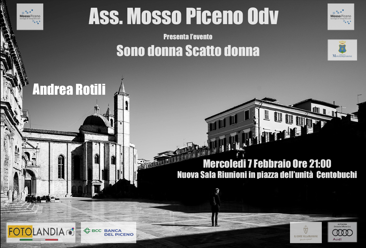 Il 7 febbraio l'Associazione Mosso Piceno nel corso della rassegna "Sono donna, Scatto donna", ospiterà il fotografo Andrea Rotili, l'incontro sarà gratuito, aperto a tutti e si terrà nella nuova sala riunioni in piazza dell'Unità a Centobuchi dalle ore 21. La serata sarà incentrata sulla fotografia di eventi musicali Jazz, sulla fotografia corporate per le aziende, sulla street, il wedding e tanto altro. Un'occasione di confronto e di dibattito con sullo sfondo le immagini create dal Fotografo.