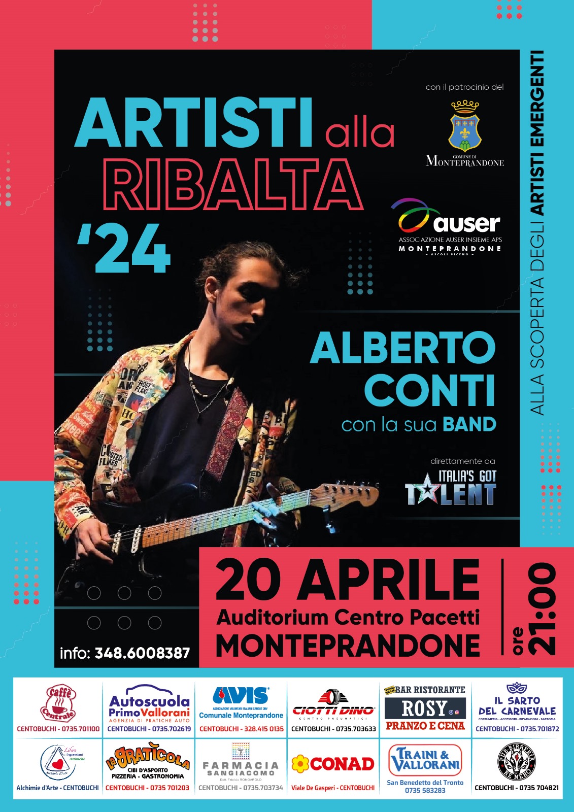 Dopo la partecipazione al programma televisivo Italia’s Got Talent 2022, che è stata inserita dalla trasmissione di Sky tra le esibizioni più emozionanti di questa edizione, il giovanissimo cantautore modenese Alberto Conti si esibirà con la sua Band in un Concerto della durata di due ore sabato 20 aprile, alle ore 21, al Centro Pacetti di Centobuchi.