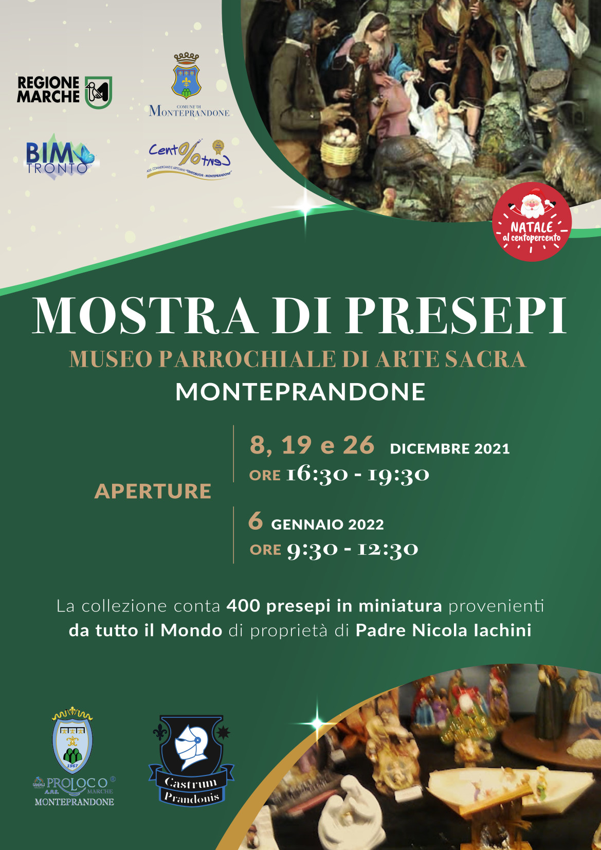 L’esposizione è stata inserita tra le iniziative in programma per il cartellone di eventi Natale al Centopercento organizzati dall’associazione Centopercento con il patrocinio e il sostegno del Comune di Monteprandone e del BIM Tronto e il patrocinio della Regione Marche. L’esposizione è curata da Padre Nicola Iachini e realizzata in collaborazione con la Proloco Monteprandone e l’associazione Castrum Prandonis.