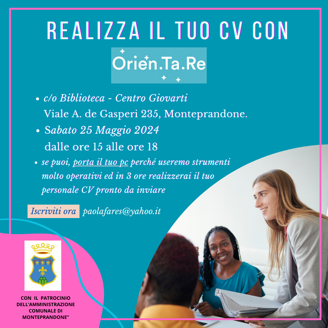 Per questo l'A.P.S Orien.ta.re, con il patrocinio del Comune di Monteprandone, organizza un incontro per aiutare in concreto a realizzare il proprio CV ideale.