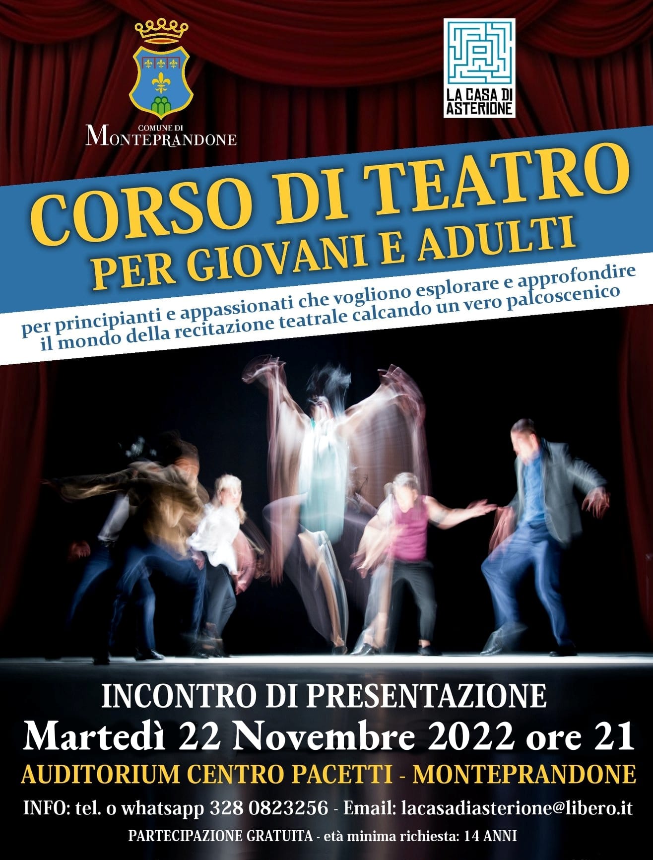 Il Comune di Monteprandone, in collaborazione con l’associazione di promozione sociale “La Casa di Asterione”, per il secondo anno consecutivo, organizza un corso di teatro gratuito riservato a giovani e adulti.