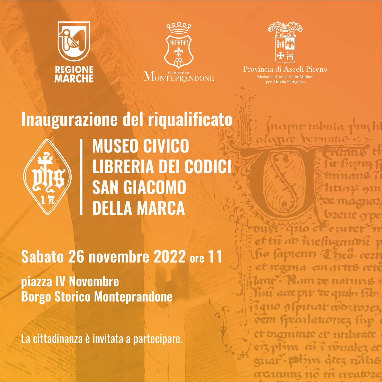 Sabato 26 novembre, nell’ambito dei festeggiamenti in onore del Patrono, riapre il Museo Civico Libreria del Codici di San Giacomo della Marca, edificio di proprietà comunale che custodisce preziosi volumi e manoscritti appartenuti al Santo monteprandonese.