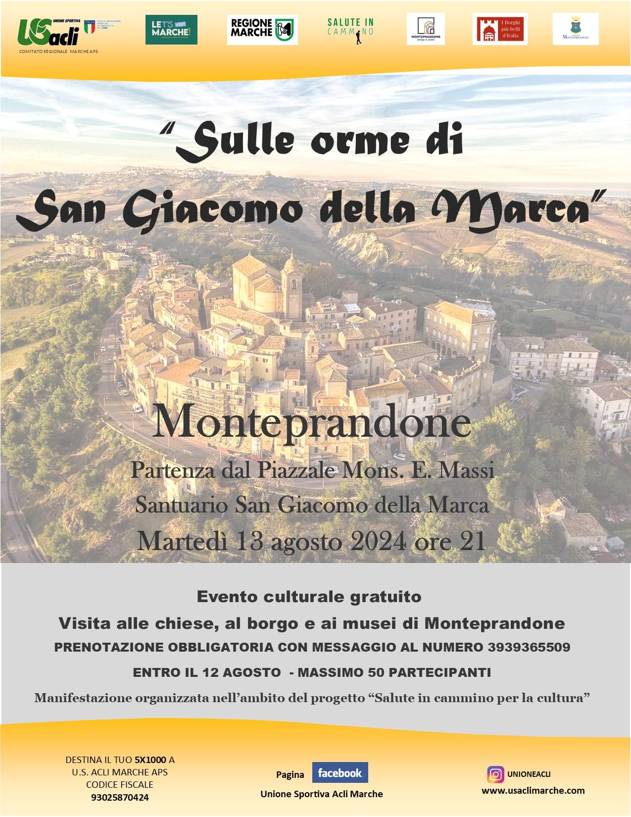 Terzo appuntamento, martedì 13 agosto a Monteprandone, con il progetto “Salute in cammino per la cultura” e con l’iniziativa “Sulle orme di San Giacomo della Marca”.