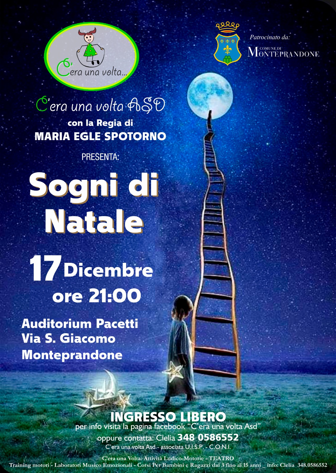 Torna come ogni anno l’appuntamento con lo spettacolo natalizio organizzato dall’associazione “C'era una volta asd”. Quest’anno la rappresentazione messa in scena dai bambini e delle bambine dell’associazione si chiama “Sogni di Natale” ed vede sempre la regia di Maria Egle Spotorno.