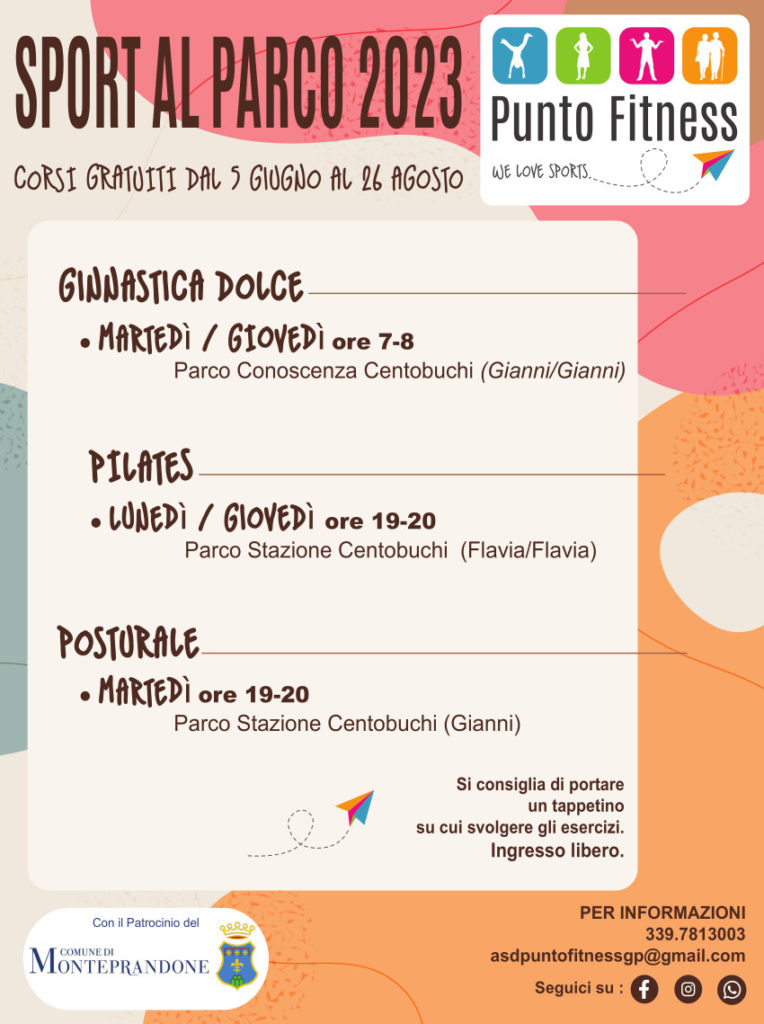 Anche per l’estate 2023 torna l'appuntamento estivo di Sport al Parco, il progetto realizzato da ASD Punto Fitness con il patrocinio dei Comuni di Monteprandone che da oltre 10 anni offre a residenti e turisti la possibilità di svolgere attività fisica all'aria aperta.