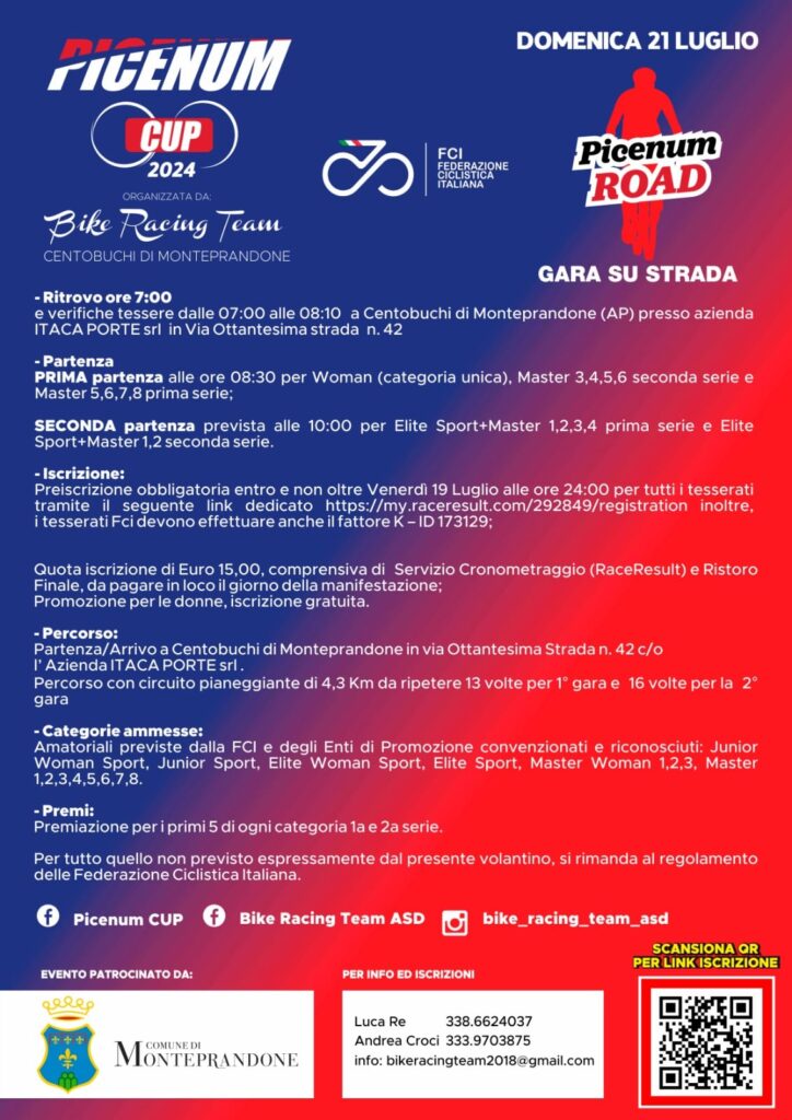 La Società Bike Racing Team Asd, con il patrocinio del Comune di Monteprandone, organizza anche per il 2024 l’evento sportivo “Picenum Cup”, con una formula rivista, ma con i soliti principi di promozione del territorio attraverso la partecipazione di atleti ed accompagnatori da tutto il territorio nazionale.