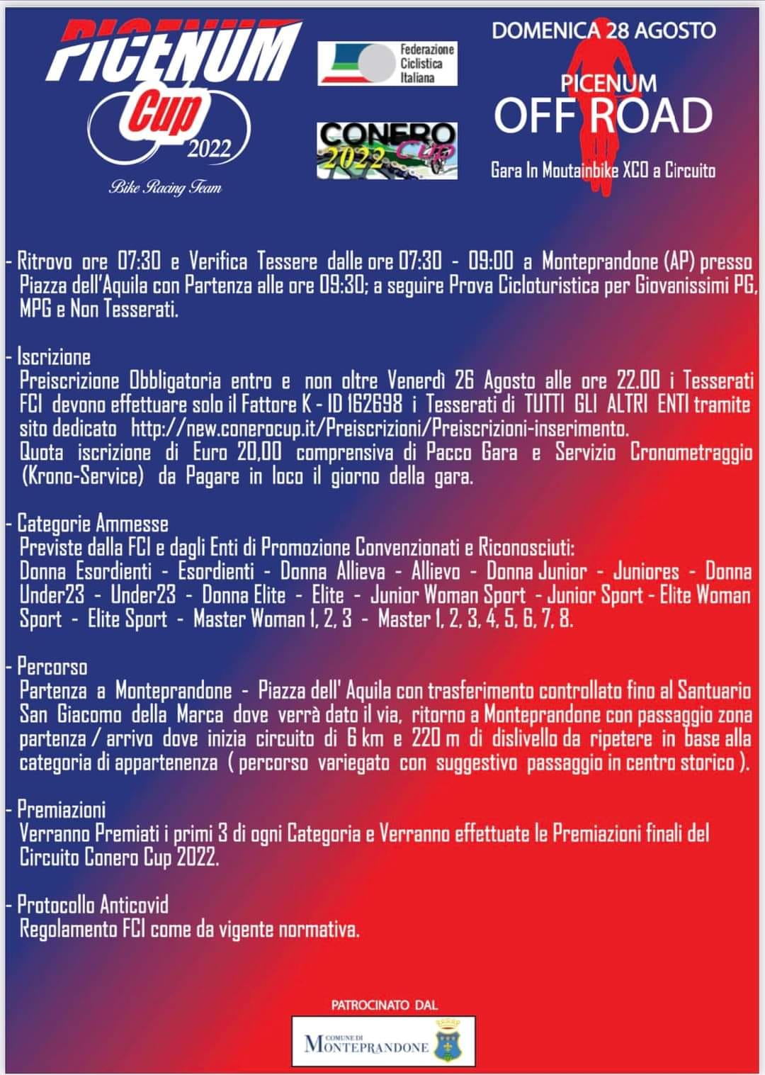Si tratta di una due giorni di gare ciclistiche che si svolgeranno interamente sul territorio del Comune di Monteprandone. La Picenum Cup 2022 consta di due specialità ciclistiche: una su strada e una in mountain bike.