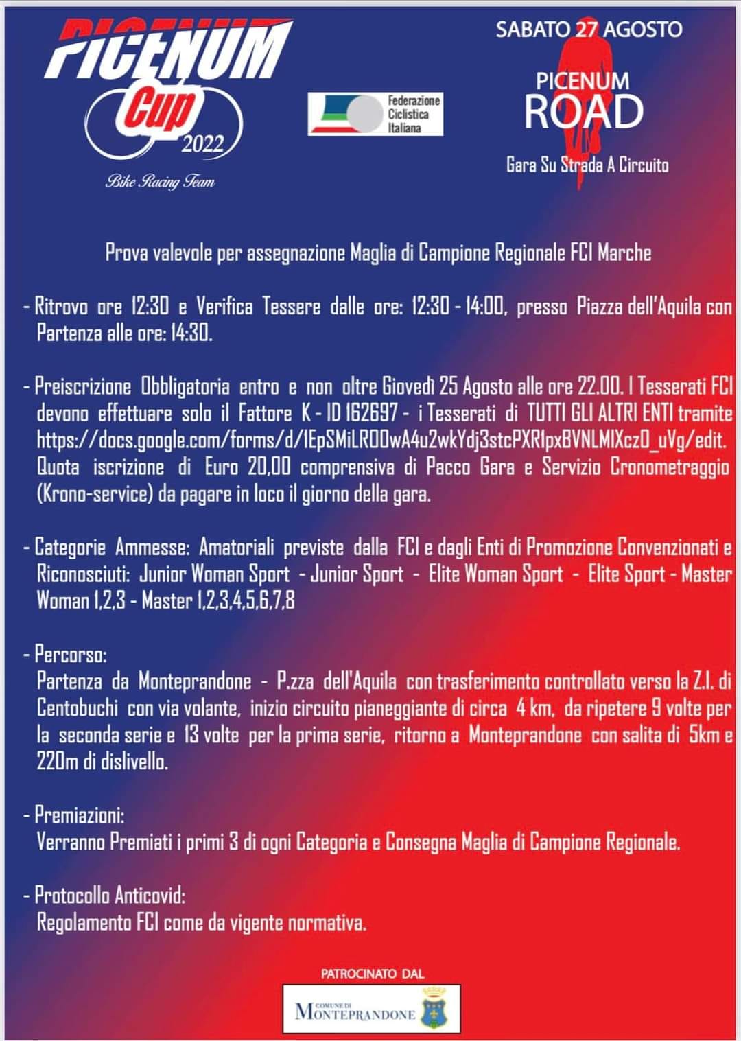 Le gare sono previste per i giorni 27 e 28 agosto 2022. Il pomeriggio di sabato 27 agosto si svolgerà “Picenum Road” gara su strada a circuito con partenza dal Centro storico di Monteprandone, si scenderà a Centobuchi e passando per la Salaria si raggiungerà la zona industriale di Centobuchi, dove verranno praticati diversi giri di un percorso predefinito per poi concludersi, nuovamente, all’interno delle antiche mura.