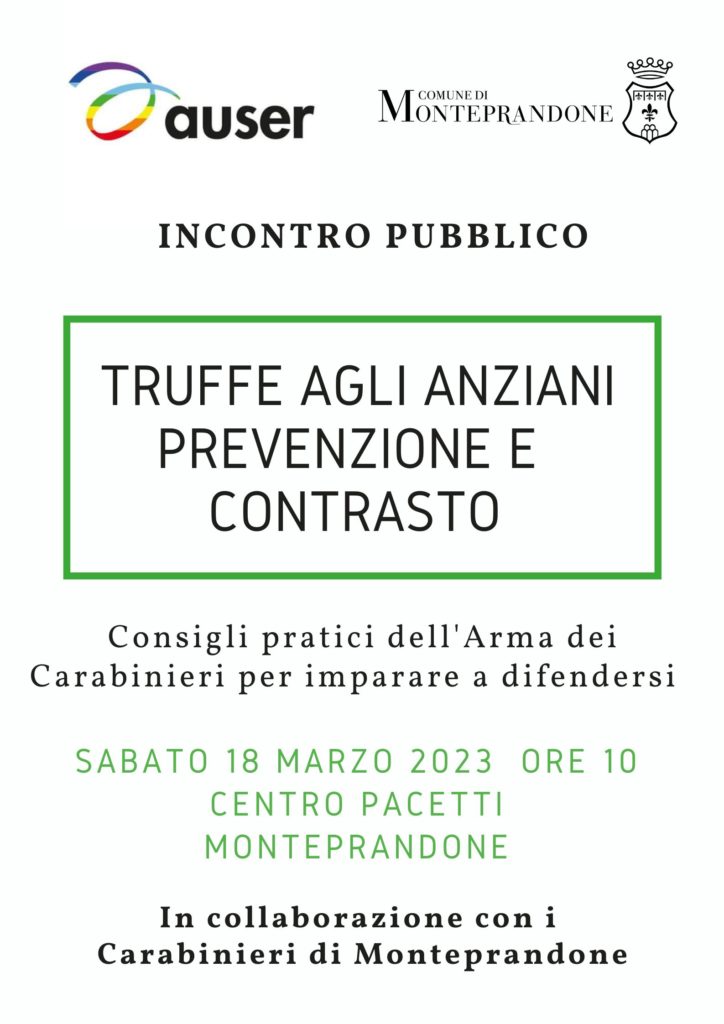 L'associazione Auser Insieme Monteprandone, con il patrocinio del Comune di Monteprandone, organizza un incontro pubblico su "Truffe agli Anziani. Prevenzione e contrasto".