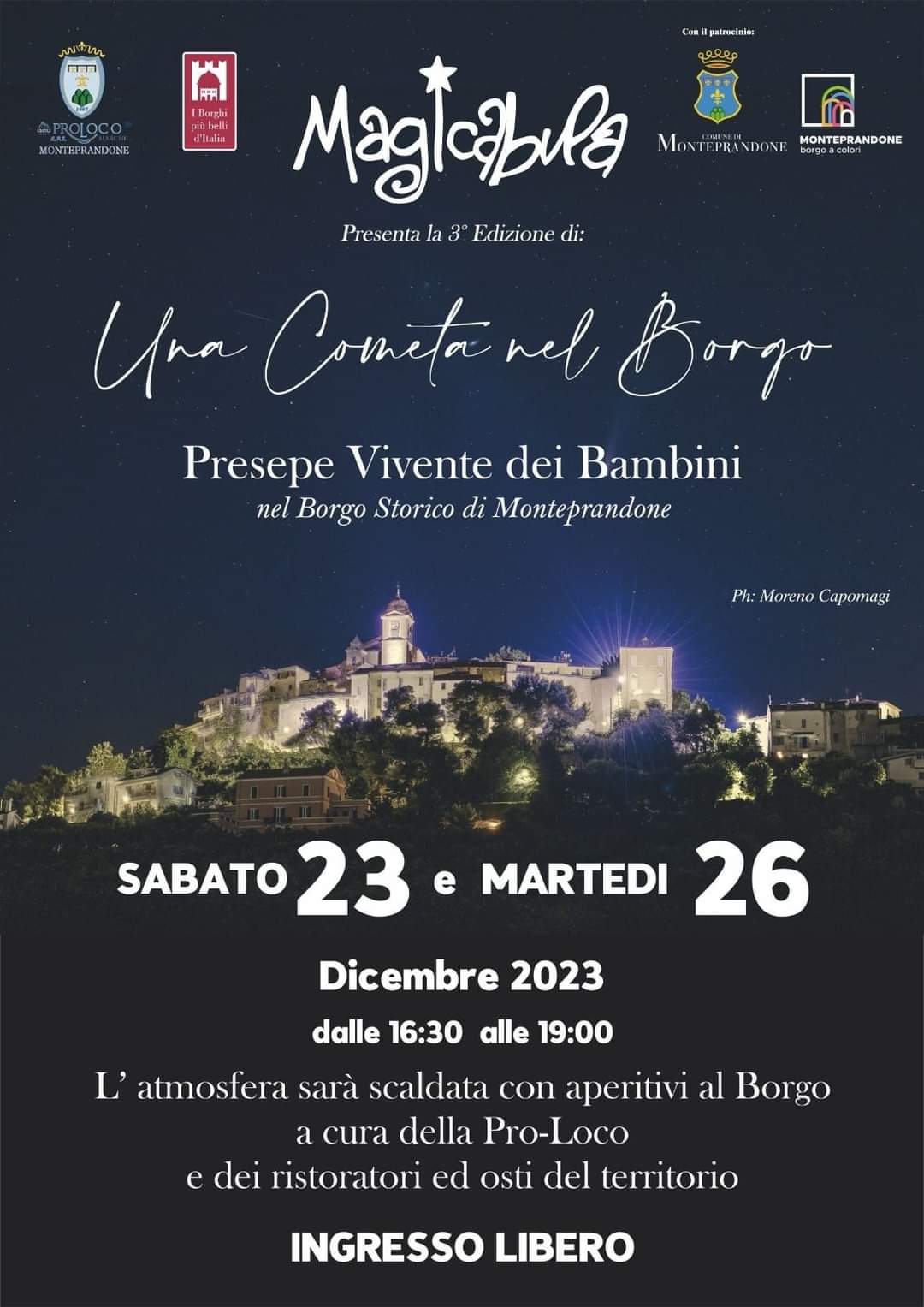 Per il terzo anno consecutivo va in scena “Una cometa nel borgo”, il presepe vivente dei bambini e delle bambine dell’asilo nido “Magicabula”, realizzato in collaborazione con la Proloco di Monteprandone e patrocinato dal Comune.