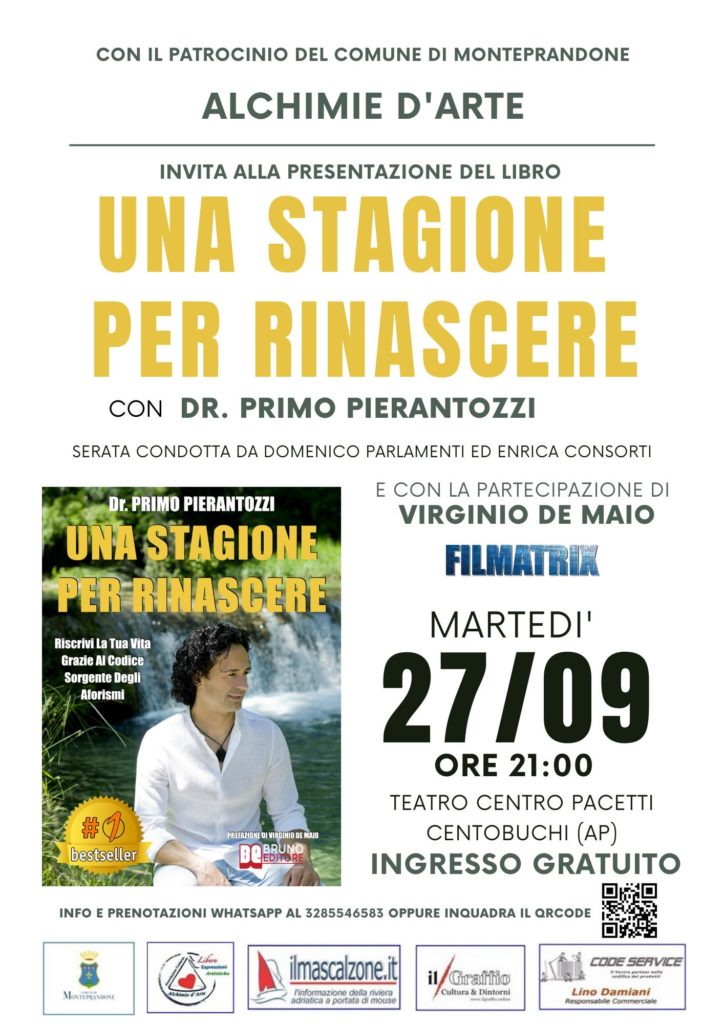 Alchimie d’Arte, un nuovo, grande, evento organizzato dall’associazione culturale di Domenico Parlamenti ed Enrica Consorti, in collaborazione con l’Avis di Monteprandone e il suo presidente Marcello Fratini, che vedrà protagonista il Dott. Primo Pierantozzi con la presentazione della sua nuova opera “Una Stagione Per Rinascere”.