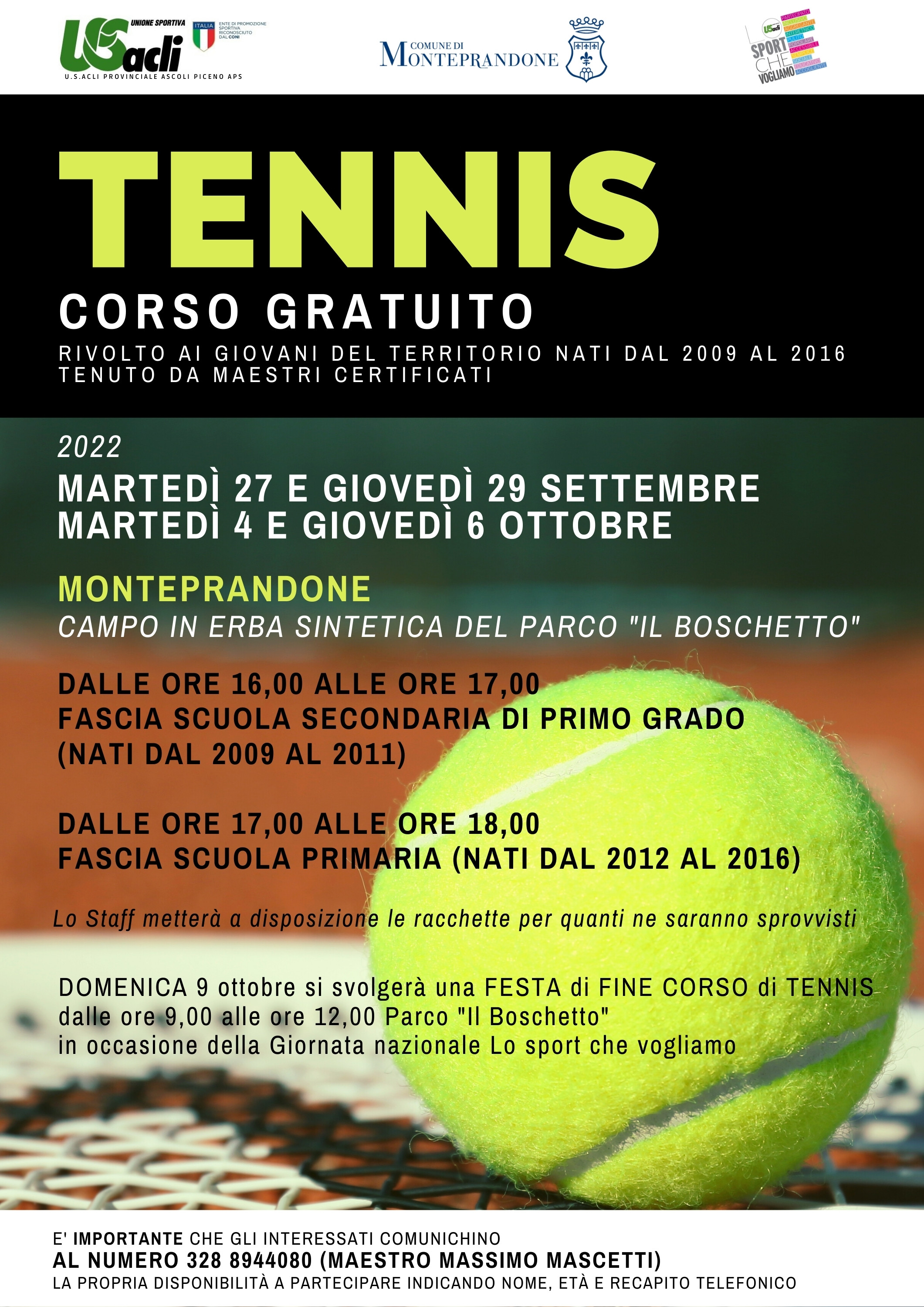 Domenica 9 ottobre, poi, si svolgerà una festa di fine corso di tennis (dalle ore 9 alle ore 12), sempre presso il parco “Il Boschetto” in occasione della Giornata nazionale Lo sport che vogliamo organizzata da U.S. Acli in tutta Italia.