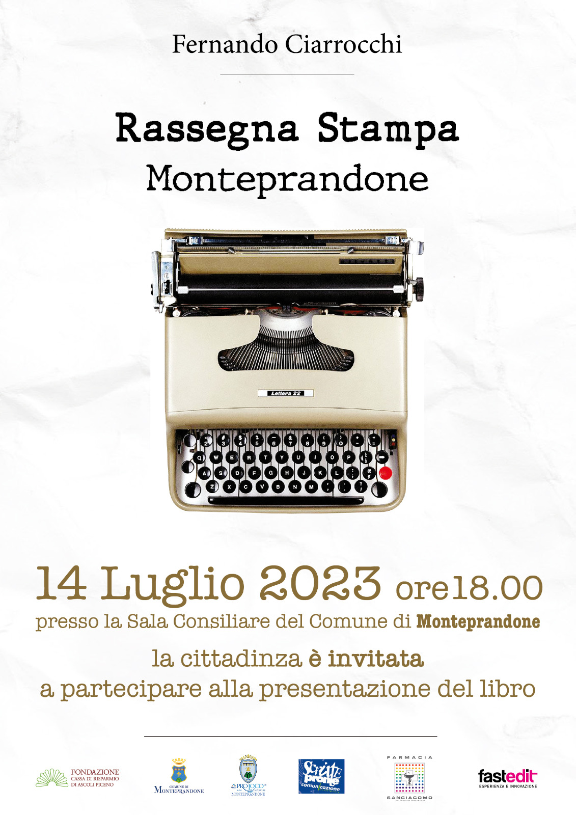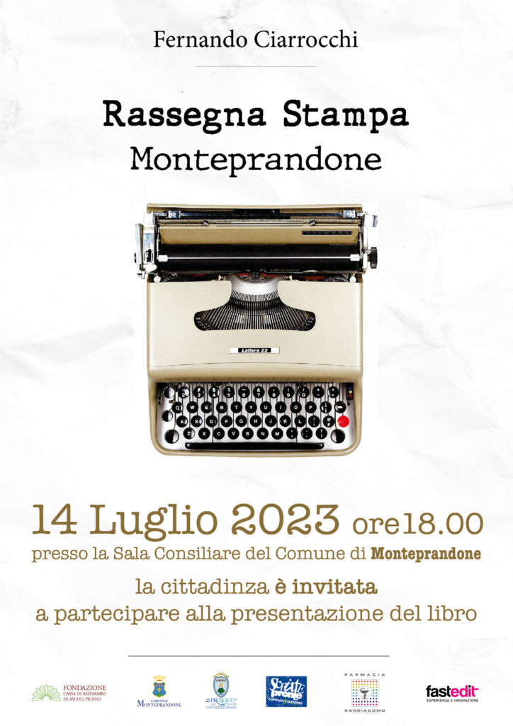 E’ stato presentato, giovedì 29 giugno, in conferenza stampa il volume “Rassegna Stampa Monteprandone. Cultura, politica, storia e tradizioni” curato dal dott. Fernando Ciarrocchi, pubblicato da Capponi Editore. Il progetto editoriale è promosso dalla Proloco Monteprandone, finanziato dalla Fondazione Carisap e dalla Farmacia San Giacomo, patrocinato dal Comune di Monteprandone, con la collaborazione di Fast Edit e Scritte Pronte.