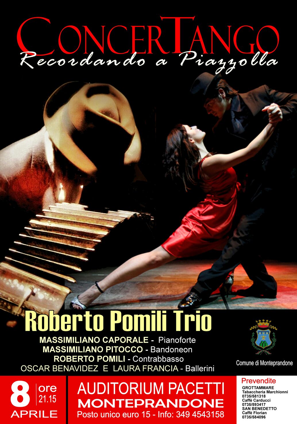 Si terrà sabato 8 aprile, alle 21,15, all'Auditorium del Centro "Pacetti" di Monteprandone l'evento "Concertango", un viaggio alla scoperta delle migliori musiche tradizionali argentine. Si partirà alle 19,30 con uno stage gratuito sulle tecniche tanguere tenuto dai ballerini Oscar Benavidez e Laura Francia. Alle 21,15 invece ci sarà il concerto, a pagamento, dedicato ad Astor Piazzolla, musicista, compositore e arrangiatore, noto nell’ambiente musicale per aver contaminato tango e jazz, creando una versione più moderna della danza. A salire sul palco saranno tre musicisti: Massimiliano Pitocco al bandoneon, Massimiliano Caporale al pianoforte e Roberto Pomili al contrabbasso. Infine alle 22,30, è prevista una dimostrazione di Milonga di Oscar Benavidez e Laura Francia. L'evento è patrocinato dal Comune di Monteprandone.