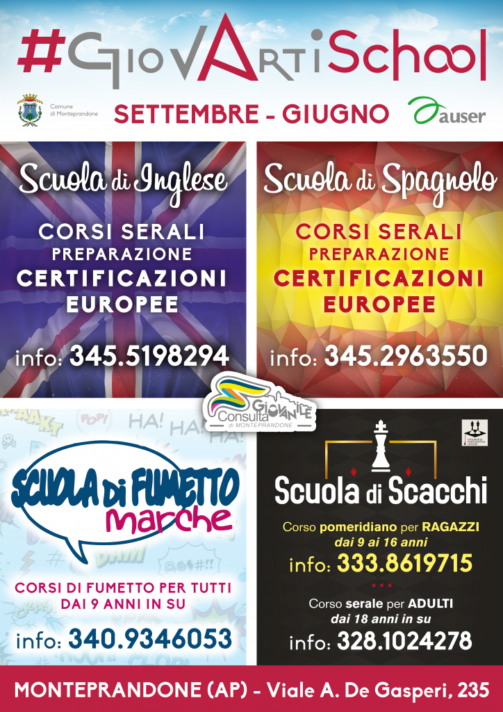 A settembre ripartono i corsi del GiovArti School di Monteprandone ed è tempo di iscrizioni ai diversi insegnamenti: inglese corso Pet, spagnolo corso base e dele, fumetto over 9, scacchi per ragazzi dai 9 ai 16 anni e over 18.