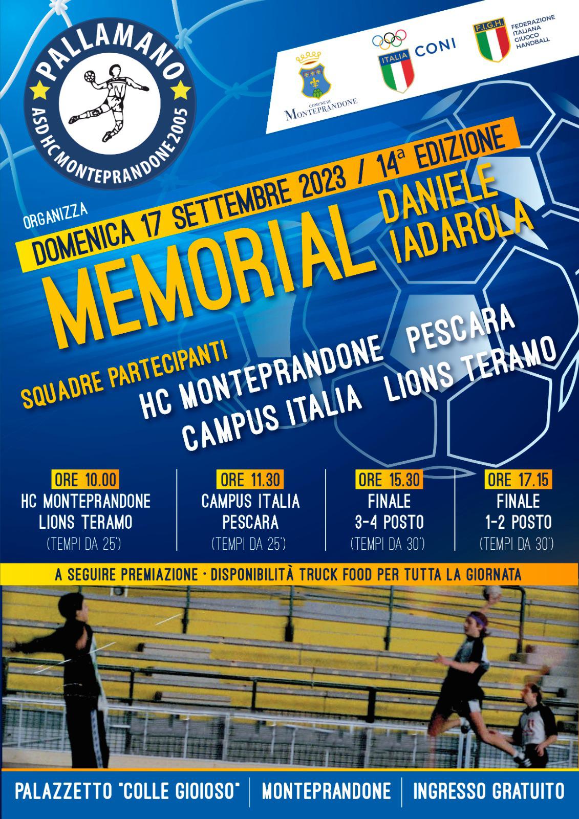 L’edizione numero 14, e sarà la solita emozione. L’Handball Club si prepara all’ormai consueto appuntamento precampionato, organizzato con il patrocinio del Comune: il Memorial Daniele Iadarola, lo sfortunato giocatore blu morto nel 2006 e figlio del fondatore della pallamano monteprandonese, Pasquale, si disputerà domenica 17 settembre al palazzetto di via Colle Gioioso.