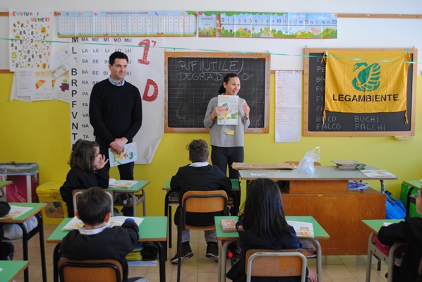 Alcune volontarie di Legambiente, attraverso un quaderno illustrato redatto in linguaggio semplice con il supporto di disegni e un gioco sul riciclo, hanno invitato i bambini a riflettere sulle buone prassi per effettuare la raccolta differenziata, sul risparmio delle materie prime, sul superamento del concetto di rifiuti a favore di quello di risorsa. Invitato dall’Istituto comprensivo e da Legambiente, il sindaco Stefano Stracci ha portato il saluto ai bambini.
